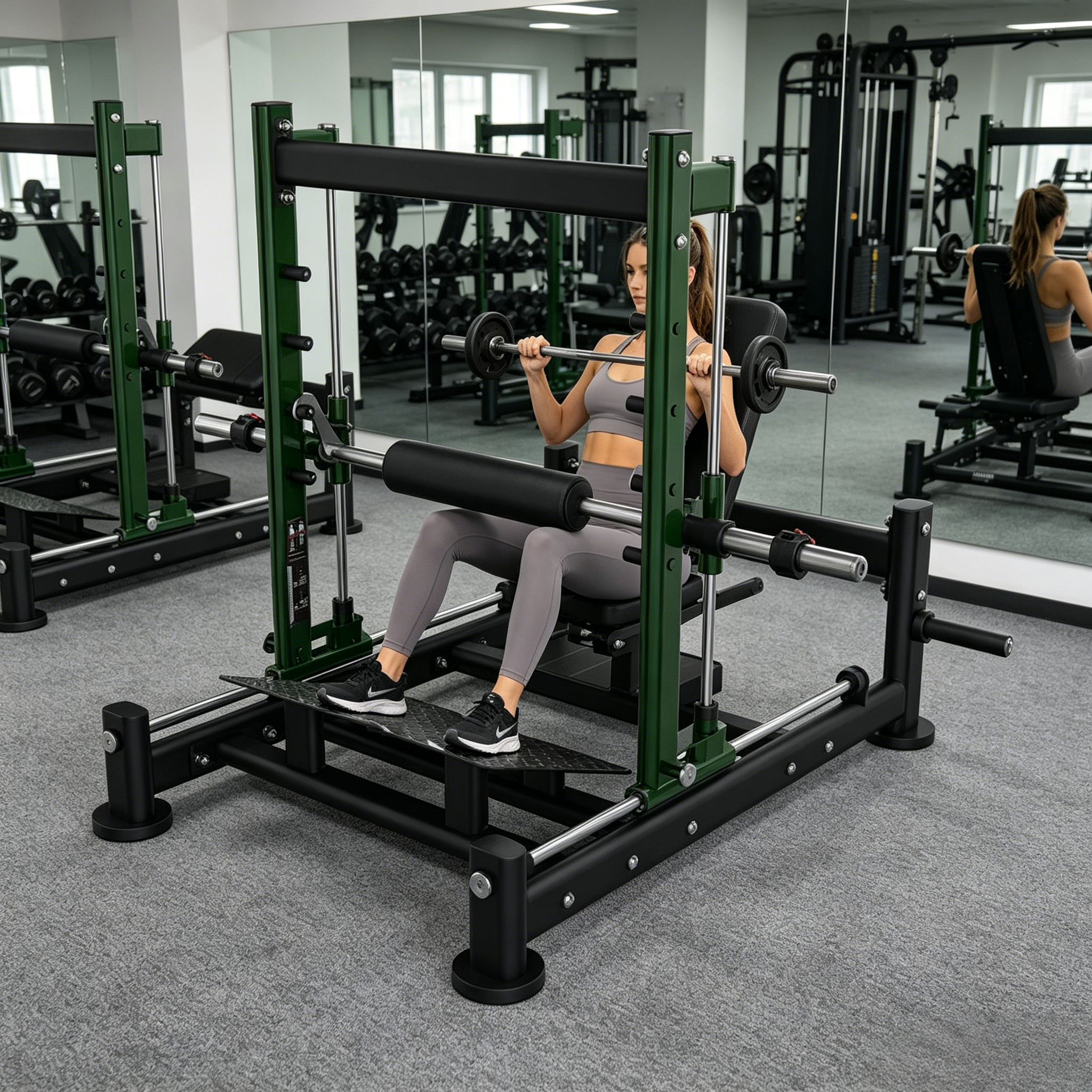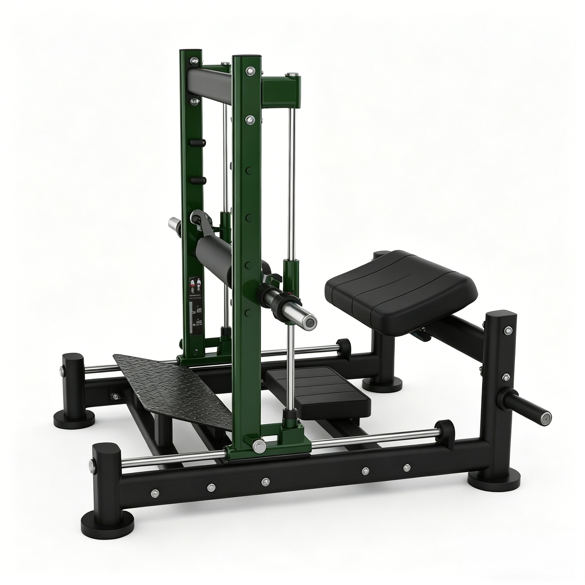 - 绿色和黑色商业级设备,关节友好型深蹲机