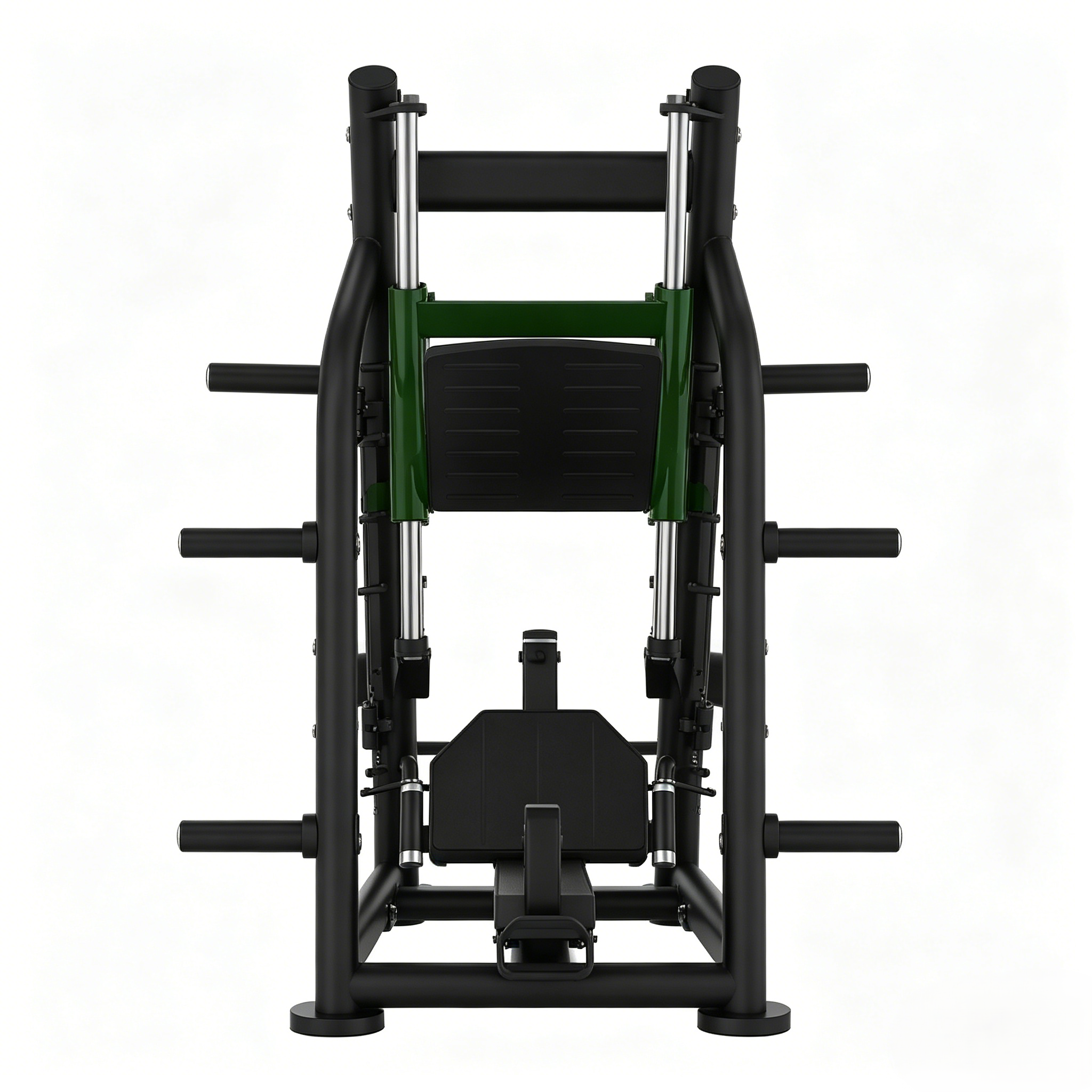 Ergonomic Footplate & Footrests: Extra-large, non-slip footplate with textured surface accommodates various foot positions, optimizing biomechanics for both quads and glutes activation. The built-in footrests provide safe transition in and out of the machine.