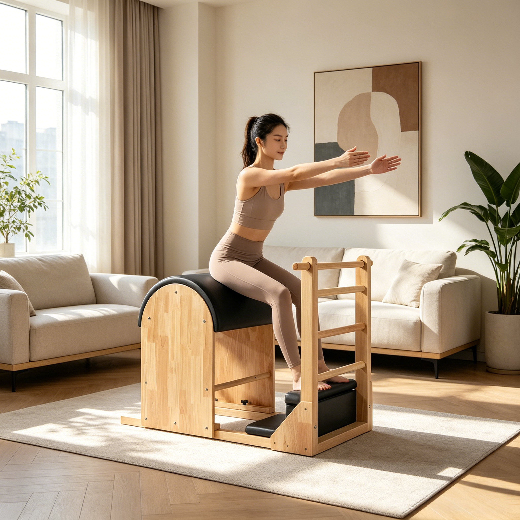 Sturdy Ladder Attachment: Integrated solid wood ladder with multiple rungs offers versatile leverage points for assisted stretches, balance drills, and resistance training, expanding the range of exercises.
